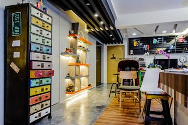 Bare concrete and wooden surfaces usually beam with details, but their energy drowns in this peculiar home that’s pregnant with colours and bric-a-brac. It’s a testament to the lively personality of homeowner Aeden, whose penchant for playing host to his whole fam bam inspired him to build a café-esque nook right in his home. A bedroom wall was sacrificed to accommodate the central artery of the space, a communal table, which Aeden hopes will promote conversation (à la pre-smartphone days).