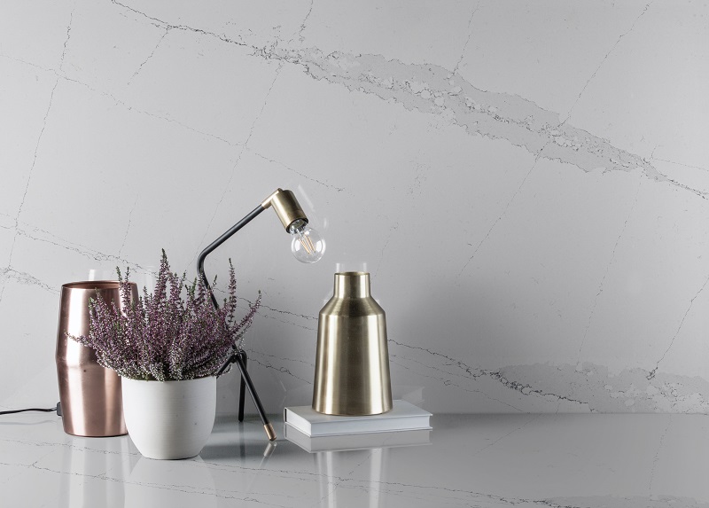 To give your kitchen or bathroom countertops a luxurious look, you can pair any of these lovely whites with bold dark colours (black, dark greys, dark neutrals) and metallic accents.