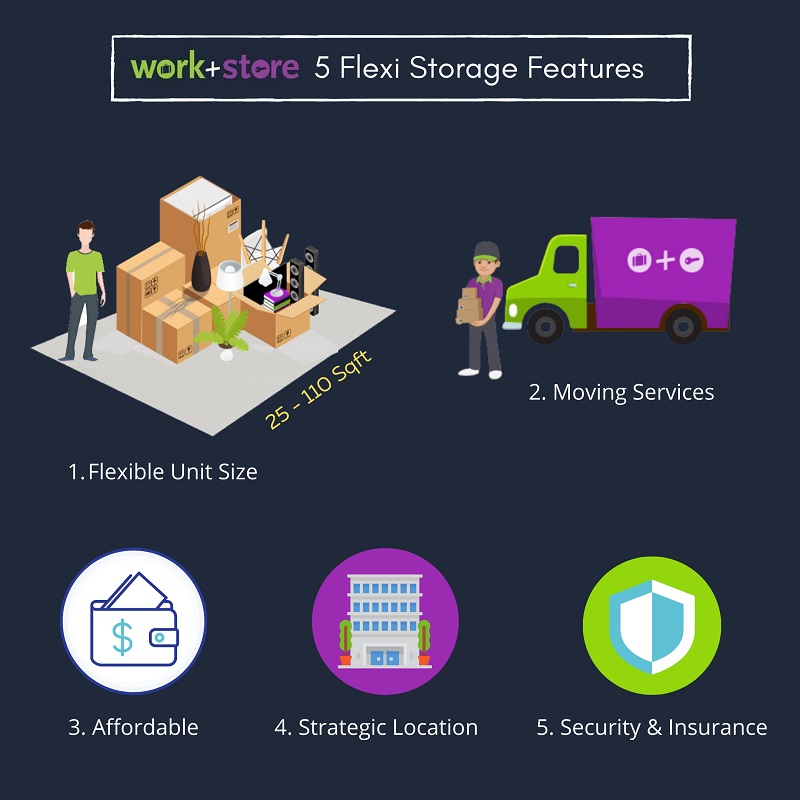 Work+Store introduces new Flexi Space storage, a one-stop storage solution from movers to storage and you will only pay for the space required for your items! Enjoy the lowest rate from just a $99/month storage fee.