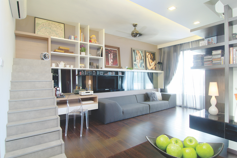 The homeowners wanted a loft-inspired abode much like the ubiquitous studios in New York City. With roughly 900 square feet area, there really isn’t much free play. Despite this setback, Astley still managed to conjure a plan that addressed his client’s brief, yet upheld Sky Creation’s philosophy. Lofts are traditionally high ceilinged and spacious, so he decided to construct a staircase in the living room to exude the feeling of an open space. It might seem like a madcap idea, but this out-of-the-ordinary suggestion made a statement-making focal point. “I integrated extra mileage into this striking feature by fitting it with secret compartments that boast generous storage space at the base,” explains Astley.