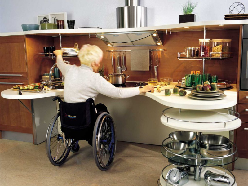 Lower kitchen countertops or tables will allow the elderly to prep their own food despite being wheelchair-bound or sitting down. Even if not, low countertops will make it easier for an elderly to work for those with a slouch.